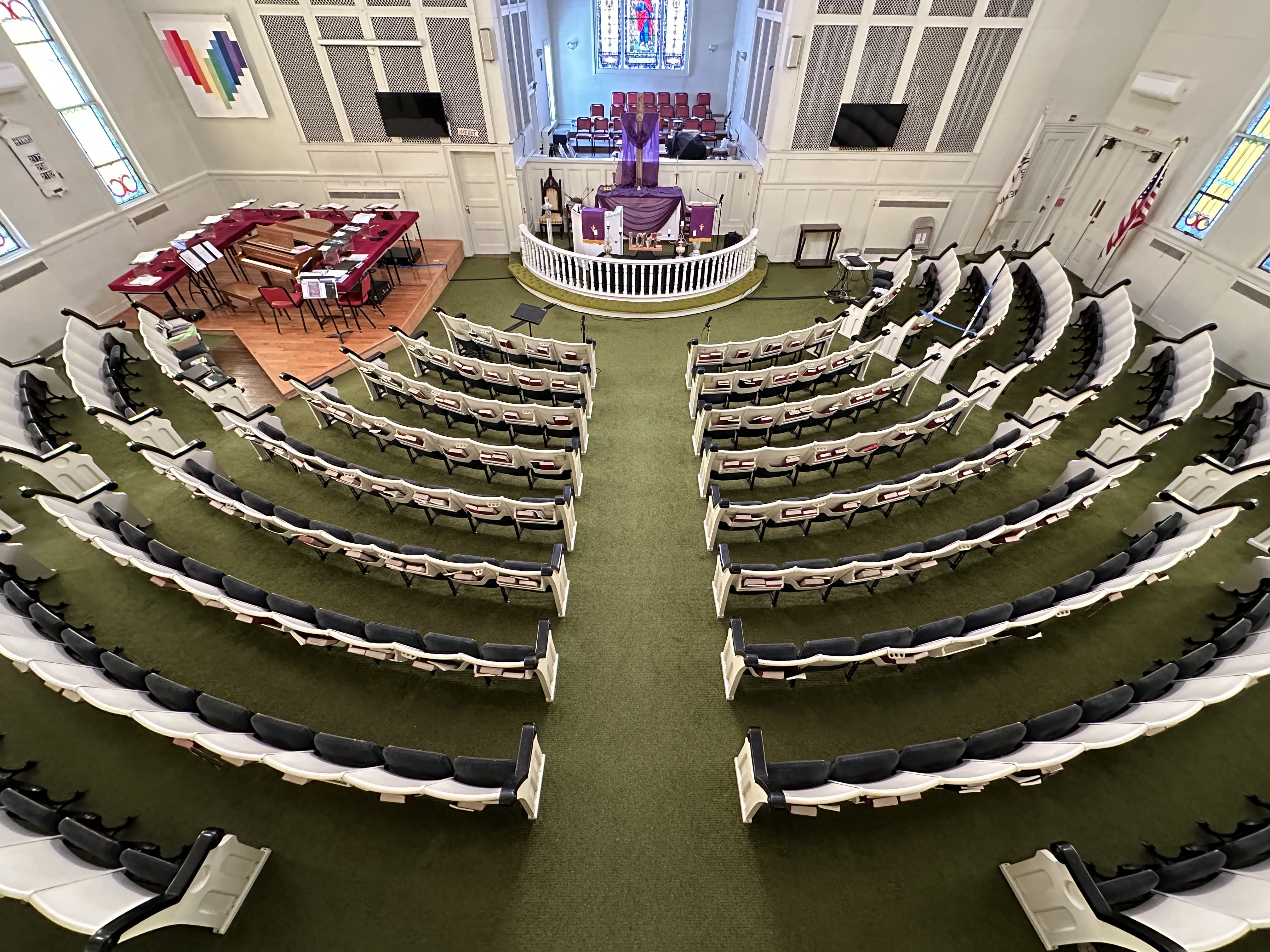 Our sanctuary holds about 250 worshipers and during worship is filled with music,